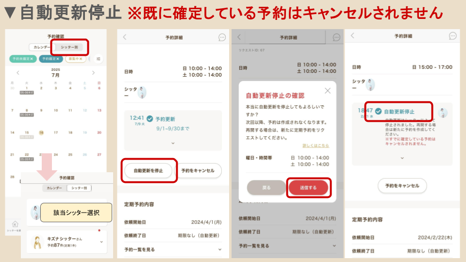 必ずシッターさんと事前にメッセージで自動更新を停止する旨を合意の上、お手続きをお願いいたします。自動更新停止をすると、次回以降の自動更新が停止となります。
