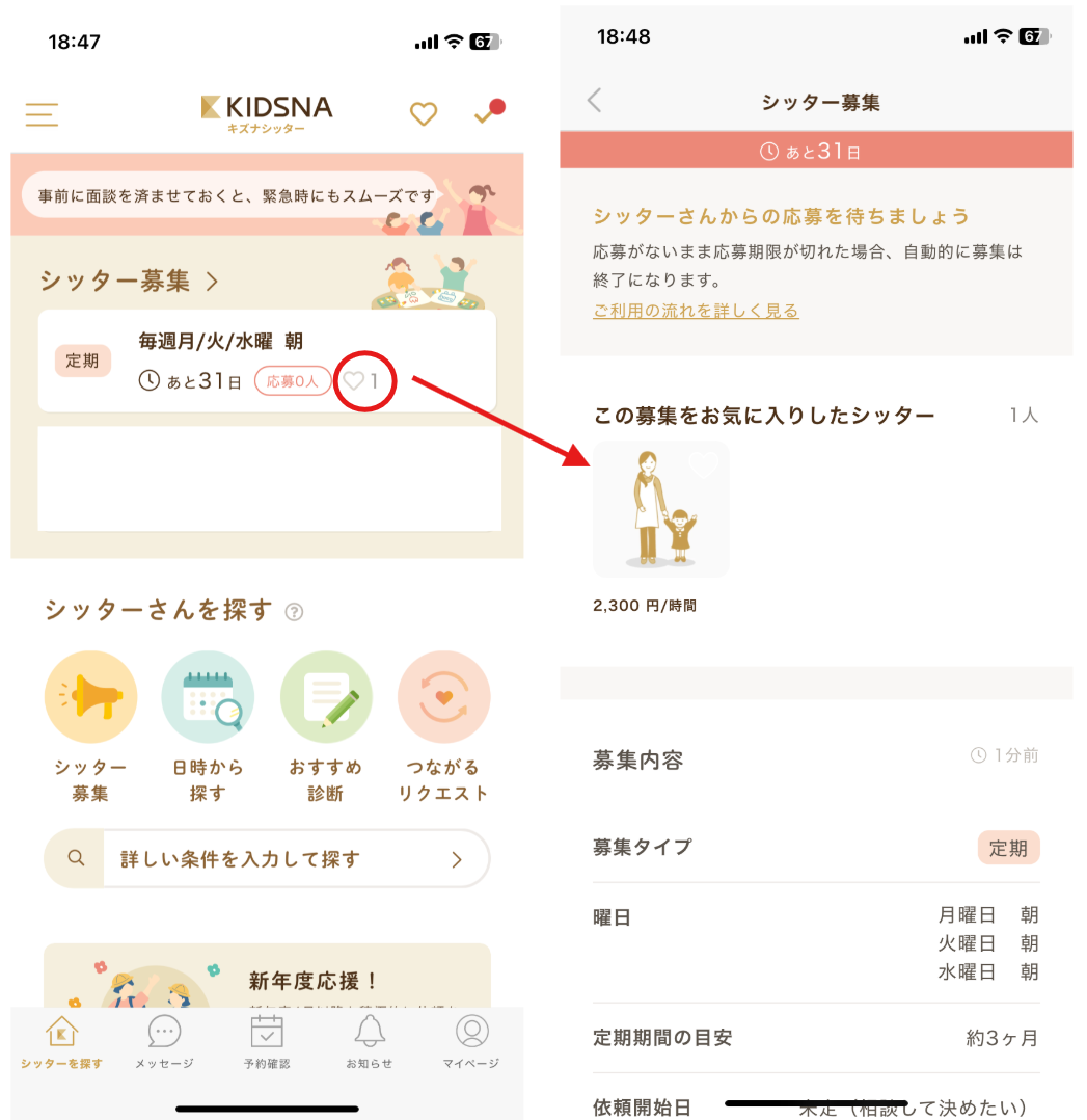 シッター募集に対して、シッターさんが「お気に入り」登録できるようになりました。