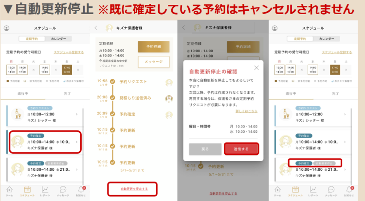 ※一度自動更新を停止すると、自動更新は再開できません。再開する場合は、保護者さまから新たに定期予約リクエストを送っていただく必要がございます。