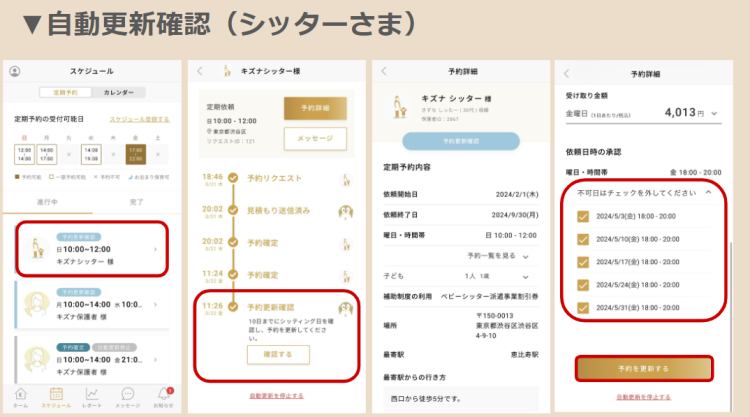 【4】毎月11日に、更新が確定した日程が保護者さま、シッターさまへ通知され、アプリ上でも予約が確定されます。