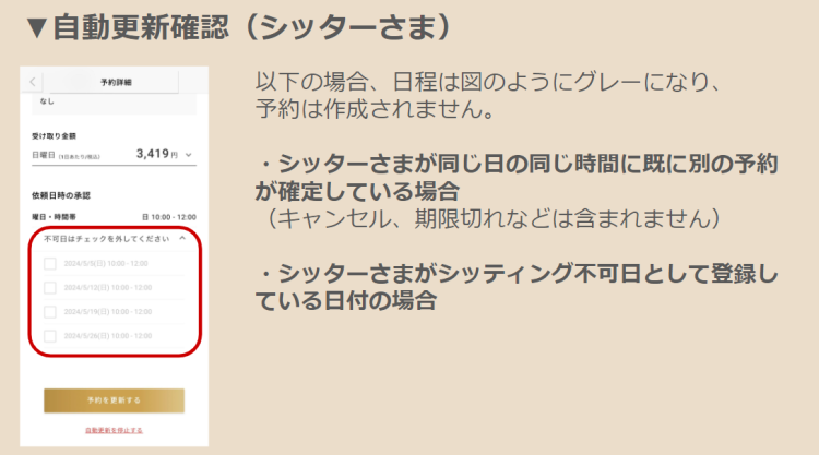 ・自動更新後に確定した予約を辞退することは、原則禁止です。シッターさまからの予約確定後の辞退は利用規約上も禁止とさせていただいております。酌量すべきケースを除くシッター様からの辞退はペナルティ対象となりますのでご注意ください。